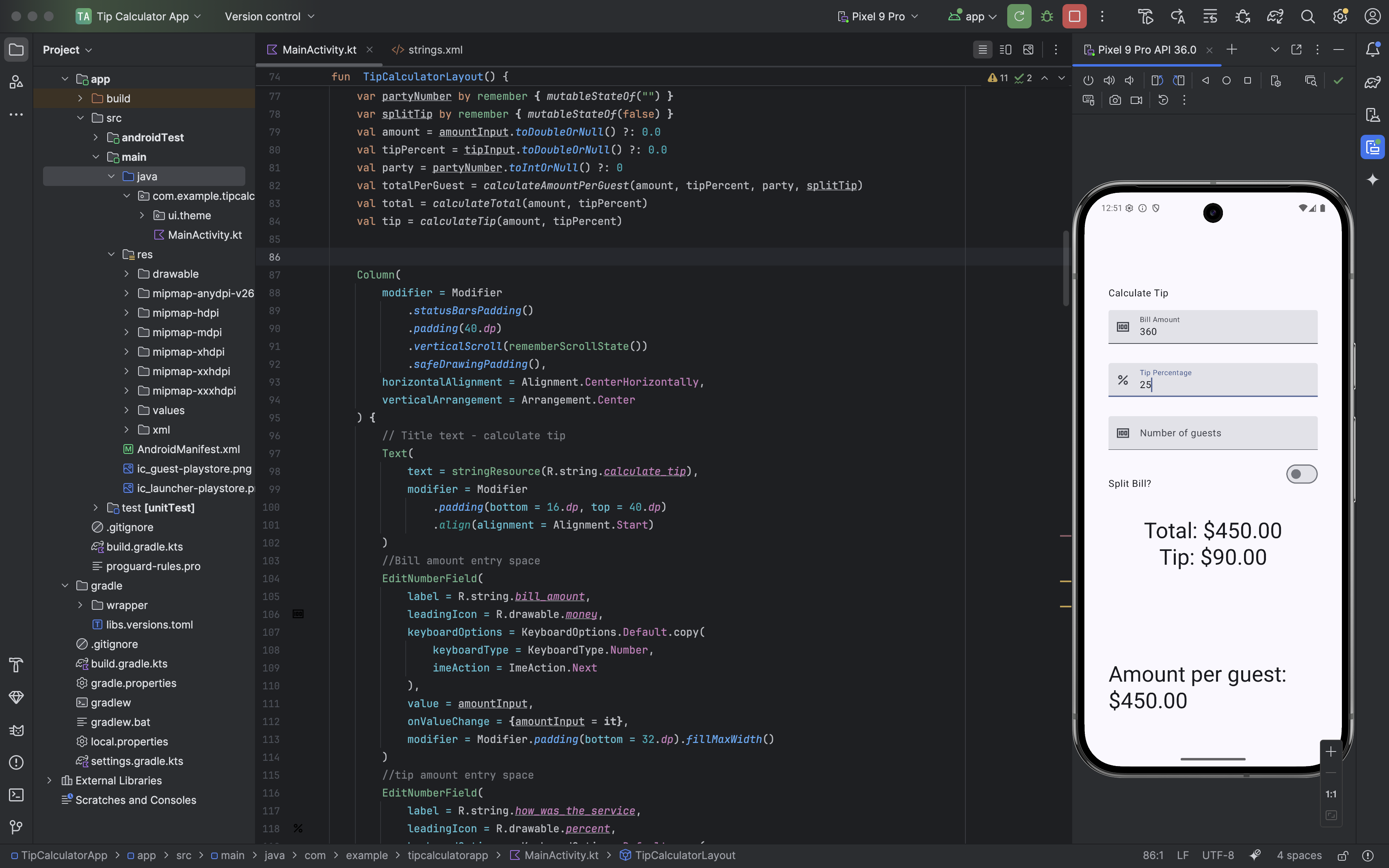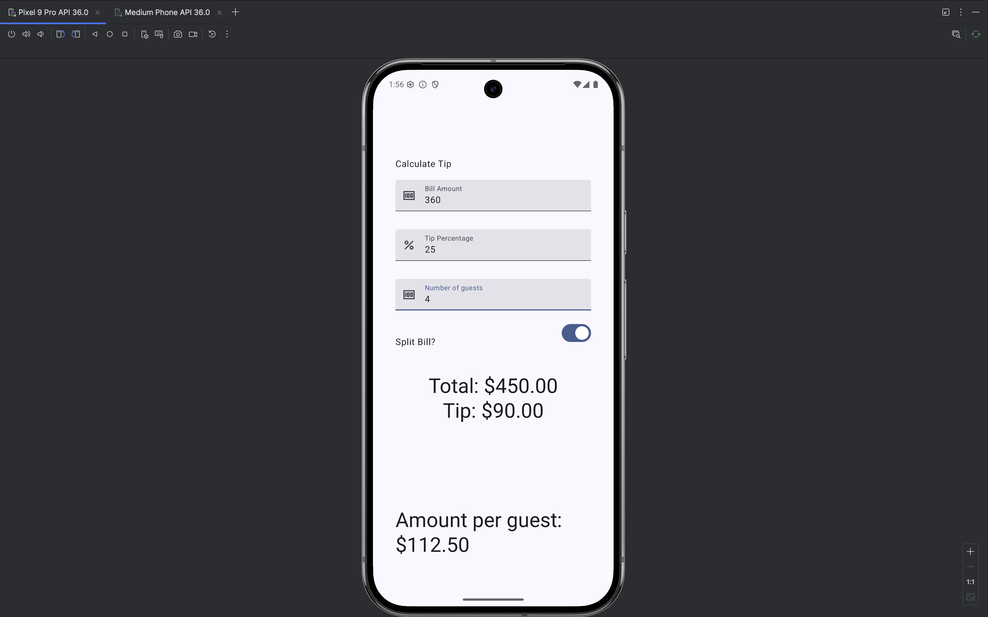For this application I took what we learned in “Android Basics with Compose” and I modified the script we wrote by adding additional code. First I knew that we needed to be able to input the amount of guests so I included another EditNumberField in my TipCalculatorLayout() method. This edit field allowed for input of the number of guests so we could take that input and divide the total. The number of guests would only be used in the calculation if the switch was changed to indicate a split bill. Because we didn't need to round up the tip with this version I modified the round up to be a split tip boolean switch. Additionally we needed to know how much the total was with tip as well as the total if split between a number so I added two additional methods one to calculate total per guest and another to calculate just the tip amount. To calculate the total per guest I took the amount input and added the calculated tip then had that divided into the number of guest input.